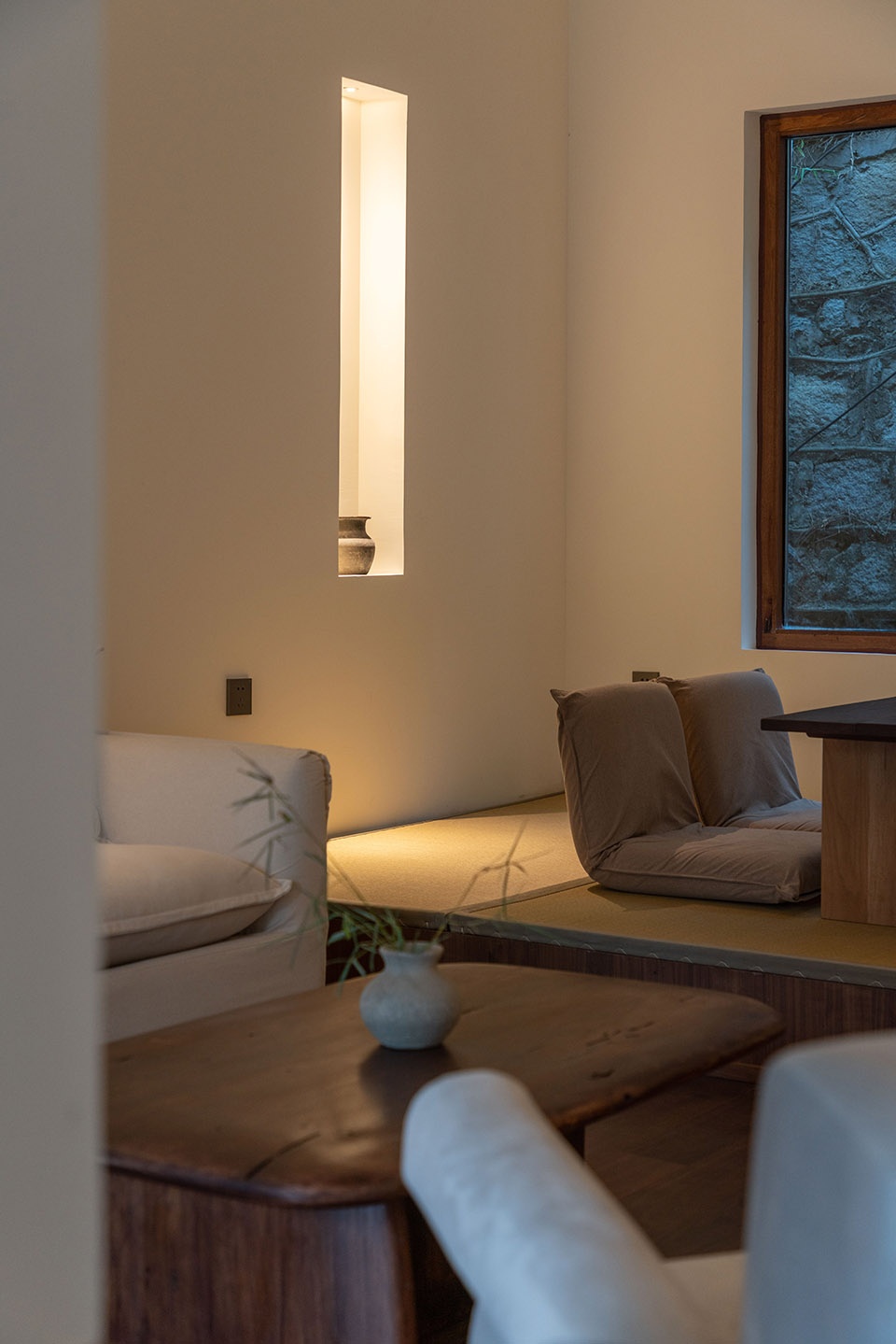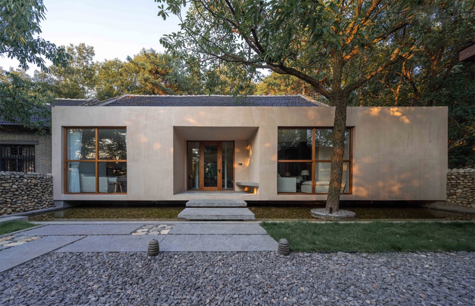 院落尺寸东西为15米,南北10米,入口与围墙现状较好且极具当地传统特色,因此将其完整地保留下来,留存了原有院落意境与氛围的记忆。内部的座椅、绿植、树木及卵石路等元素则显得较为杂乱,对其进行了重新梳理后,保留了现状的两棵树木。